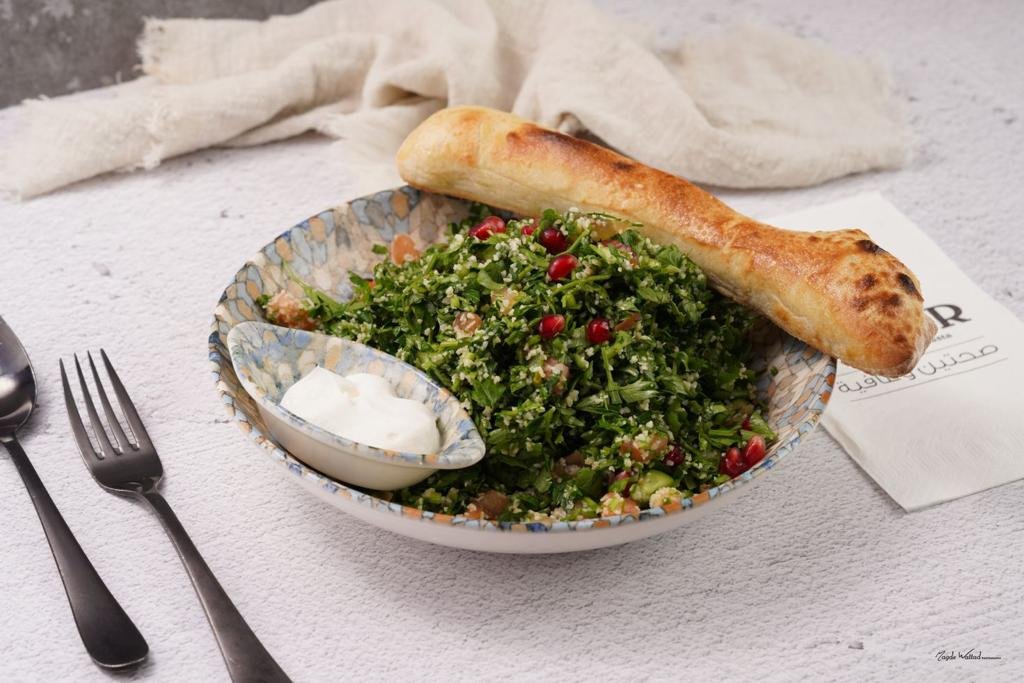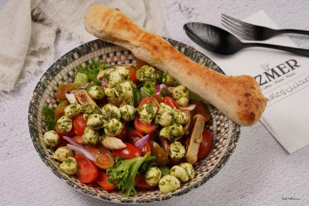 مكونات السلطة: بندورة شيري الوان | جرجير | بصل | بيتسو | تين مجفف | كرات موزاريلا | فطر | اوراق ريكولا